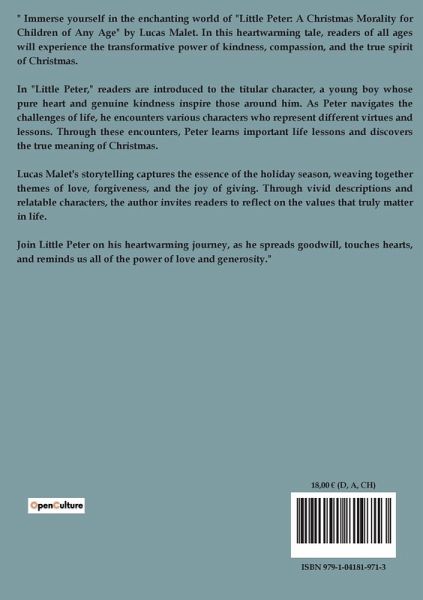 " Immerse yourself in the enchanting world of "Little Peter: A Christmas Morality for Children of Any Age" by Lucas Malet. In this heartwarming tale, readers of all ages will experience the transformative power of kindness, compassion, and the true spirit of Christmas. In "Little Peter," readers are introduced to the titular character, a young boy whose pure heart and genuine kindness inspire those around him. As Peter navigates the challenges of life, he encounters various characters who represent different virtues and lessons. Through these encounters, Peter learns important life lessons and discovers the true meaning of Christmas. Lucas Malet's storytelling captures the essence of the holiday season, weaving together themes of love, forgiveness, and the joy of giving. Through vivid descriptions and relatable characters, the author invites readers to reflect on the values that truly matter in life. Join Little Peter on his heartwarming journey, as he spreads goodwill, touches hearts, and reminds us all of the power of love and generosity."