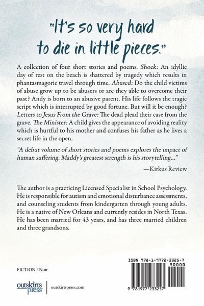 Little Pieces It's so very hard to die in little pieces, Not by cancer ravaged over time, Or by bullet suffered grievous wound, But by hateful act or cruel word, Tiny bits of tissue rot from human bone. It's so very hard to die in little pieces, Not from thirst for lack of water, Or from starvation for not a morsel to eat, But for lack of a mother's kiss Or for the presence of a father's love. It's so very hard to die in little pieces, Bruise by bruise, blow by blow, Tissue torn, skin burned deep, broken bone, All alone, completely forgotten. It's so very hard to die in little pieces. Tiny pieces of humanity have been strewn over the face of the earth for many millennia with no end in sight. These are stories of human suffering reflecting the dilemma of how can an individual survive in the face of worldwide cataclysmic events or personal tragedies, whether self-inflicted or as a victim? "What can I possibly do? Leave me alone. I never asked for this" Hide you might, resist you will, but your fate remains your own. Noir is a genre characterized by cynicism, fatalism and especially moral ambiguity. However, these stories, dark as they are, may have gems buried deep within them. Search deeper! Perhaps light dwells in the darkest of corners! These stories and poems are continuous action, psychologically thrilling and thought-provoking as well as entertaining to the reader desiring something from the world of noir but with a twist. Each story has a "you never saw that coming" ending. A collection of four short stories and four poems. Shock: An idyllic day of rest on the beach is shattered by tragedy which leads to phantasmagoric travel through time and history. It ends where it started. To sacrifice oneself is a voluntary act, or is it? Whether by choice or chance, what will I do when confronted with human suffering? Abused: Do the child victims of abuse grow up to be abusers or are they able to overcome their past? Andy is born to an abusive parent. His life follows the tragic script which is suddenly interrupted by good fortune. But will it be enough? Time and circumstance has charted his self-destructive course but can the determined love of another soften and recast Andy's future? Letters from the Grave: The dead plead their case from the grave. Ignorance, anger and arrogance confront the Messiah. What hope does He offer them? And does that hope extend beyond the grave? The Minister: A child with a severe facial disfigurement gives the appearance of avoiding reality which is hurtful to his mother and confuses his father as he lives a secret life in the open. Four poems, including: O, Mother, Have You Heard: Having to endure the loss of a child might be the greatest of human suffering. "A debut volume of short stories and poems explores the impact of human suffering. Maddy's greatest strength is his storytelling..." -Kirkus Review