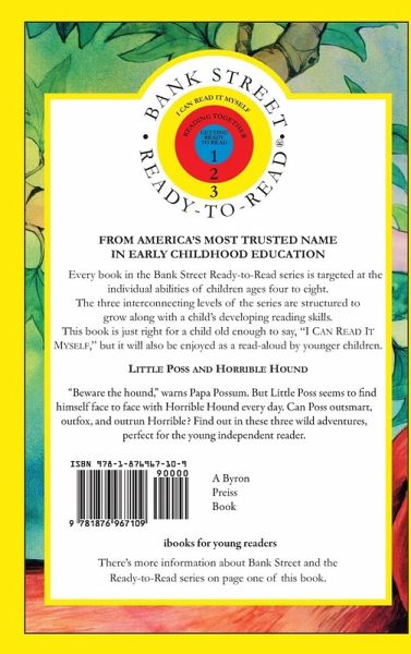 "Beware the hound," warns Papa Possum. But Little Poss seems to find himself face to face with Horrible Hound every day. Can Poss outsmart, outfox, and outrun Horrible? Find out in these three wild adventures, perfect for the young independent reader. ¿FROM AMERICA’S MOST TRUSTED NAME IN EARLY CHILDHOOD EDUCATION More than seventy years of educational research and innovative teaching have given the Bank Street College of Education the reputation as America’s most trusted name in early childhood education. Because no two children are exactly alike in their development, we have designed the Bank Street Ready-to-Read series in three levels to accommodate the individual stages of reading readiness of children ages four through eight. • Level 1: GETTING READY TO READ— (PRE-K to GRADE 1) Books are perfect for reading aloud with children who are getting ready to read or are just beginning to read words or phrases. • Level 2: READING TOGETHER—(GRADES 1 to 3) Books are written especiallly for children who are on their way to reading independently but who may need help. • Level 3: I CAN READ IT MYSELF—(GRADES 2 to 3) Books are designed for children able to read on their own. They also can be enjoyed as read-alouds.