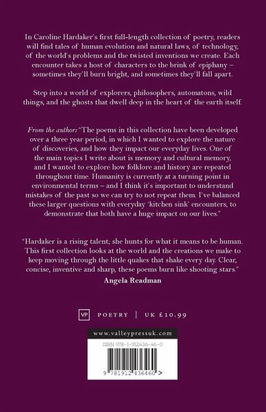 In Caroline Hardaker's first full-length collection of poetry, readers will find tales of human evolution and natural laws, of technology, of the world's problems and the twisted inventions we create. Each encounter takes a host of characters to the brink of epiphany - sometimes they'll burn bright, and sometimes they'll fall apart. Step into a world of explorers, philosophers, automatons, wild things, and the ghosts that dwell deep in the heart of the earth itself. From the author: "The poems in this collection have been developed over a three year period, in which I wanted to explore the nature of discoveries, and how they impact our every day lives. One of the main topics I write about is memory and cultural memory, and I wanted to explore how folklore and history is repeated throughout time. Humanity is currently at a turning point in environmental terms - and I think it's important to understand mistakes of the past so we can try to not repeat them. I've balanced these larger questions with everyday 'kitchen sink' encounters, to demonstrate that both have a huge impact on our lives." "Hardaker is a rising talent, she hunts for what it means to be human. This first collection looks at the world and the creations we make to keep moving through the little quakes that shake every day. Clear, concise, inventive and sharp, these poems burn like shooting stars." - Angela Readman