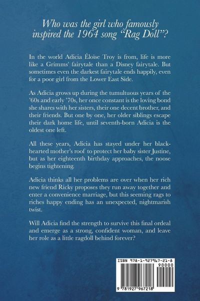 In the world Adicia Éloïse Troy is from, life is more like a Grimms’ fairytale than a Disney fairytale. But sometimes even the darkest, most twisted fairytale has a happy ending, even for a poor girl from the Lower East Side. In spite of the rough life she’s been born into, Adicia is buoyed by the loving bond she shares with her sisters, their one decent brother, and their friends. Though her parents expect all nine of their offspring to follow in their footsteps by remaining in the old neighborhood, dropping out of school, and working low-paying, dead-end jobs, Adicia, her sisters, and her brother Allen have higher aspirations. Oldest sister Gemma becomes a sacrificial lamb when their parents derail her plans to go to college and force her to marry an awful much-older man, but Gemma gets the last laugh and shows her sisters they can get above their raising by escaping the old neighborhood, leaving poverty, and going to college. It's no longer just an idle pipe dream after they've seen it done within their own family. Gemma's breakaway starts a chain reaction that leaves Mr. and Mrs. Troy increasingly humiliated, angry, and helpless. It seems like hard times are over forever when Allen makes good and moves his sisters into his new West Village apartment. However, this paradise only lasts five and a half months. Almost as soon as Mrs. Troy finishes a short prison term, she forces her daughters to move to the family's new tenement in Hell's Kitchen on Christmas Eve. Adicia experiences many highs and lows during her seven years in Hell’s Kitchen, all the while still sustained by the love of her sisters, Allen, and their friends. Among the highlights of this grim period is Adicia's chance meeting with a kind stranger who turns out to be a famous pop star. This encounter inspires a #1 hit song during the summer of '64. The lowest point of this grim period comes when Mrs. Troy manipulates Adicia into sacrificing one of the few things a poor girl has going for herself, just so Adicia can save her from returning to prison. At the close of the Sixties, the family moves back to the Lower East Side. In January 1972, Adicia meets Ricky Carson, a young millionaire who's just moved up the street to the newly-formed East Village. They form an unlikely friendship, against the disapproval of their parents and Allen, and Ricky falls in unrequited love with Adicia. By this point, Mr. and Mrs. Troy are desperate to salvage what remains of their reputation, and plan to marry Adicia off to a man forty years her senior. Adicia has never considered running away like her older sisters. Once she became the biggest sister left at home at age nine, Adicia's bond with her baby sister Justine got even stronger. She's passively stayed and put up with so many indignities all so she can protect Justine. But now, with the noose tightening, Adicia has little choice left, and finally acts instead of being acted upon. Her plans to run away don't go exactly as expected, though, and she's thrust into a passive role when Ricky saves her with an offer of convenience marriage. However, this seeming rags to riches happy ending has an unexpected, nightmarish twist. Will Adicia find the strength to survive this final ordeal and emerge as a strong, confident woman, and leave her role as a little ragdoll behind forever?