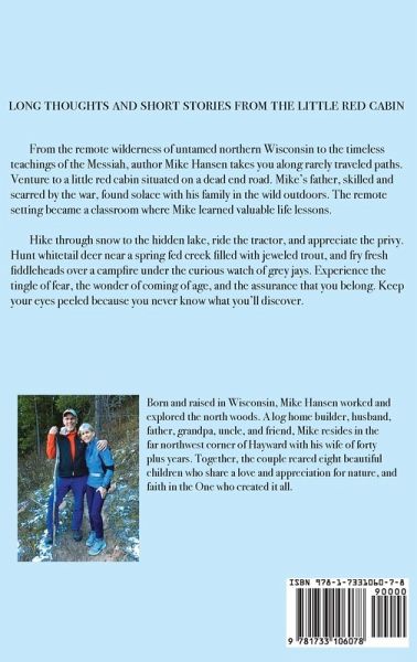 From the remote wilderness of untamed northern Wisconsin to the timeless teachings of the Messiah, author Mike Hansen takes you along rarely traveled paths. Venture to a little red cabin situated on a dead end road. Mike's father, skilled and scarred by the war, found solace with his family in the wild outdoors. The remote setting became a classroom where Mike learned valuable life lessons. Hike through snow to the hidden lake, ride the tractor, and appreciate the privy. Hunt whitetail deer near a spring fed creek filled with jeweled trout, and fry fresh fiddleheads over a campfire under the curious watch of grey jays. Experience the tingle of fear, the wonder of coming of age, and the assurance that you belong. Keep your eyes peeled because you never know what you'll discover.