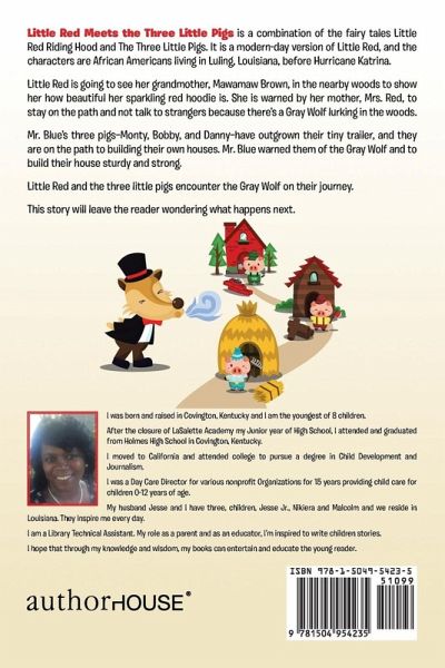 Little Red Meets the Three Little Pigs is a combination of the fairy tales Little Red Riding Hood and The Three Little Pigs. It is a modern-day version of Little Red, and the characters are African Americans living in Luling, Louisiana, before Hurricane Katrina. Little Red is going to see her grandmother, Mawamaw Brown, in the nearby woods to show her how beautiful her sparkling red hoodie is. She is warned by her mother, Mrs. Red, to stay on the path and not talk to strangers because there's a Gray Wolf lurking in the woods. Mr. Blue's three pigs-Monty, Bobby, and Danny-have outgrown their tiny trailer, and they are on the path to building their own houses. Mr. Blue warned them of the Gray Wolf and to build their house sturdy and strong. Little Red and the three little pigs encounter the Gray Wolf on their journey. This story will leave the reader wondering what happens next.