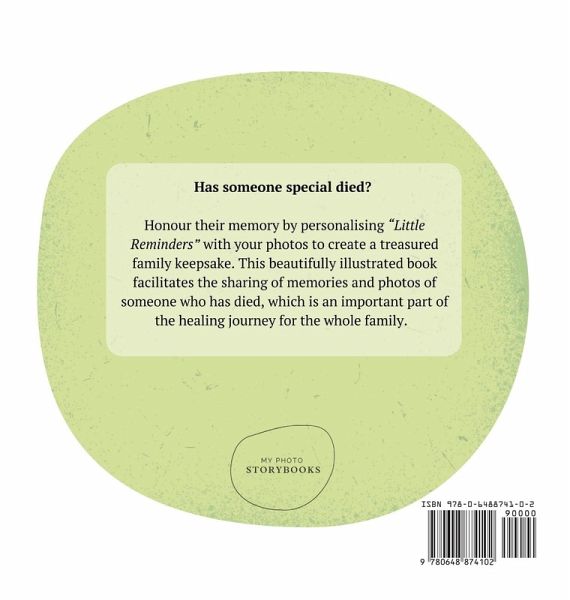 Want to treasure your memories of a loved one who has passed away? Create a precious keepsake with this personalised book. Designed to provide comfort and support for a family suffering from grief, 'Little Reminders' is an ideal tool for helping children to process the loss of a grandparent, parent, sibling, relative or friend from their life. Designed for personalisation, add the name and up to 10 photos of your loved one who has passed away to this beautifully illustrated storybook and create little reminders of their love wherever you go. A treasured keepsake for both adults and children to maintain a connection with someone who is gone, but not forgotten. Little Reminders is recommended by the National Centre for Childhood Grief and utilised by school counsellors and support organisations such as Lifeline. "Visually appealing, sensitively written, heart-warming and uplifting, 'Little Reminders' acknowledges that although people die, our relationships with them live forever and they remain a valued part of our family circle. The book is inter-active and it's easy to imagine it providing a smooth and gentle segue to other important family discussions about life and living, death and dying. I have no hesitation in recommending it to families with young children... or for use in other professional settings." Dianne McKissock OAM, Bereavement C.A.R.E. Co-founder and Patron - National Centre for Childhood Grief