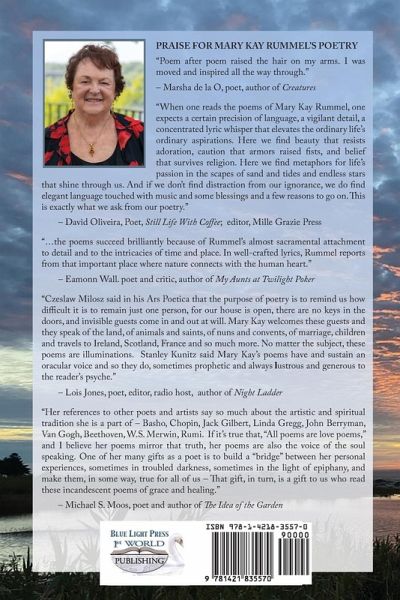 "Poem after poem raised the hair on my arms. I was moved and inspired all the way through."- Marsha de la O, poet, author of Creatures Mary Kay Rummel grew up in St. Paul near the Mississippi and the corner where Montreal, Lexington and West Seventh meet near Highland Park. She was the first Poet Laureate of Ventura County, CA. Little River of Amazements: New and Selected Poems is her tenth published poetry book, her eighth full collection. Blue Light Press also published Nocturnes: Between Flesh and Stone, Cypher Garden, The Lifeline Trembles, as a winner of the 2014 Blue Light Press Award and What's Left is the Singing. This Body She's Entered, her first book, won the Minnesota Voices Award for poetry and was published by New Rivers Press in 1989. It was a finalist for the Minnesota Book Award. She was a recipient of a Loft Mentor award. Her work has appeared in numerous regional, national, and international literary journals and anthologies and has received several awards, including ten Pushcart nominations. She was a co-editor of Psalms of Cinder & Silt, a collection of community poems related to recent California wildfires published by Glenna Luschei at Solo Press. Her poems have been published in many journals and anthologies centered in both California and the Midwest including Water~Stone Review, Alaska Quarterly Review, MiraMar, Anacapa Review, Gyroscope Review, Conestoga Zen, Pirene's Fountain, Salt, Askew, Spillway and as a frequent finalist for the Pablo Neruda Prize, in Nimrod.Mary Kay has read her poems in many venues in the US, England and Ireland and has been a featured reader at poetry festivals including in the Ojai Poetry Festival and San Luis Obisbo Poetry Fest. She has participated in numerous poetry residencies including Anderson House and Vermont Studio Center and performs poetry with musicians. She has collaborated with artists in the US and England, most recently at the Minnesota Center for Book Arts. A Professor Emerita from the University of Minnesota, Duluth, Mary Kay also taught at the University of Minnesota, Minneapolis, and at California State University, Channel Islands. She is a founding board member of the nonprofit Ventura County Poetry Project. She and her husband, Conrad (Tim), live in California and Minnesota, near children and grandchildren in both states. She can be contacted through email at marykayrummel.com