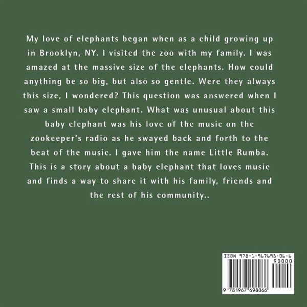 My love of elephants began when as a child growing up in Brooklyn, NY. I visited the zoo with my family. I was amazed at the massive size of the elephants. How could anything be so big, but also so gentle. Were they always this size, I wondered? This question was answered when I saw a small baby elephant. What was unusual about this baby elephant was his love of the music on the zookeeper's radio as he swayed back and forth to the beat of the music. I gave him the name Little Rumba. This is a story about a baby elephant that loves music and finds a way to share it with his family, friends and the rest of his community..