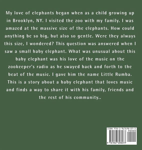 My love of elephants began when as a child growing up in Brooklyn, NY. I visited the zoo with my family. I was amazed at the massive size of the elephants. How could anything be so big, but also so gentle. Were they always this size, I wondered? This question was answered when I saw a small baby elephant. What was unusual about this baby elephant was his love of the music on the zookeeper's radio as he swayed back and forth to the beat of the music. I gave him the name Little Rumba. This is a story about a baby elephant that loves music and finds a way to share it with his family, friends and the rest of his community..