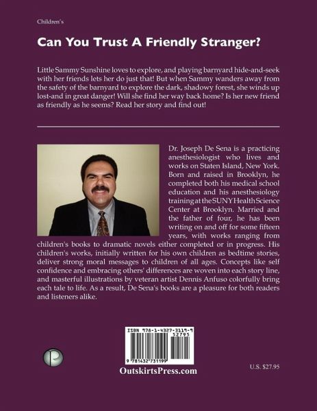 Can You Trust A Friendly Stranger? Little Sammy Sunshine loves to explore, and playing barnyard hide-and-seek with her friends lets her do just that! But when Sammy wanders away from the safety of the barnyard to explore the dark, shadowy forest, she winds up lost-and in great danger! Will she find her way back home? Is her new friend as friendly as he seems? Read her story and find out!