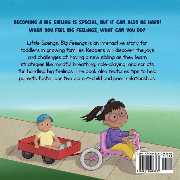 Little Siblings, Big Feelings, is an interactive story for toddlers in growing families. Readers will discover the joys and challenges of having a new sibling as they learn strategies like mindful breathing, role-playing, and scripts for handling big feelings. The book also features tips to help parents foster positive parent-child and peer relationships.