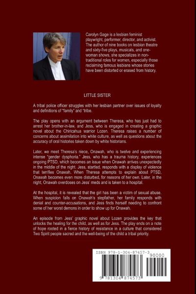 A one-act play by Carolyn Gage. A tribal police officer struggles with her lesbian partner over issues of loyalty and definitions of "family." The play ends on a note of hope rooted in a fierce history of resistance in a culture that considered Two-Spirit people sacred and the well-being of the child a tribal priority.
