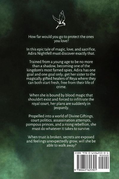 How far would you go to protect the ones you love? In this epic tale of magic, love, and sacrifice, Adira Nightfell must discover exactly that. Trained from a young age to be no more than a shadow, becoming one of the kingdom's most famed spies, Adira has one goal and one goal only; get her sister to the magically gifted healers of Reya where they can both start fresh, free from their life of crime. When she is bound by blood magic that shouldn't exist and forced to infiltrate the royal court, her plans are suddenly in jeopardy. Propelled into a world of Divine Giftings, court politics, assassination attempts, pompous princes, and a rising rebellion, she must do whatever it takes to survive. When trust is broken, secrets are exposed and feelings unexpectedly grow, will she be able to walk away?