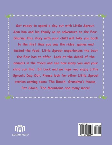 Get ready to spend a day out with Little Sprout. Join him and his family on an adventure to the Fair. Sharing this story with your child will take you back to the first time you saw the rides, games and tasted the food. Little Sprout experiences the best the Fair has to offer. Look at the detail of the animals in the trees and see how many you and your child can find. Sit back and we hope you enjoy Little Sprouts Day Out. Please look for other Little Sprout stories coming soon: The Beach, Grandma's House, Pet Store, The Mountains and many more!