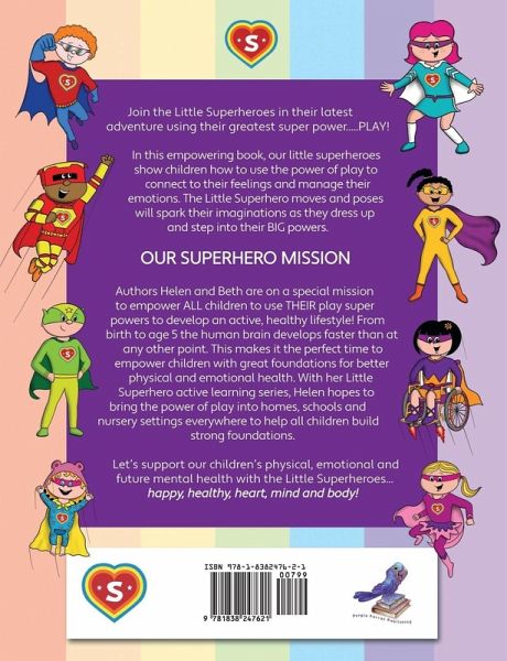 Join the Little Superheroes in their latest adventure using their greatest super power.....PLAY! In this empowering book, our little superheroes show children how to use the power of play to connect to their feelings and manage their emotions. The Little Superhero moves and poses will spark their imaginations as they dress up and step into their BIG powers. OUR SUPERHERO MISSION Authors Helen and Beth are on a special mission to empower ALL children to use THEIR play super powers to develop an active, healthy lifestyle! From birth to age 5 the human brain develops faster than at any other point. This makes it the perfect time to empower children with great foundations for better physical and emotional health. With her Little Superhero Active Learning series, Helen hopes to bring the power of play into homes, schools and nursery settings everywhere to help all children build strong foundations. Let's support our children's physical, emotional and future mental health with the Little Superheroes... happy, healthy, heart, mind and body!