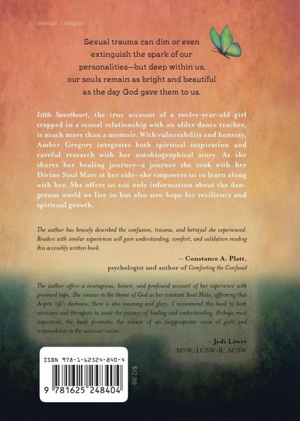 Sexual trauma can dim or even extinguish the spark of our personalities-¿but deep within us, our souls remain as bright and beautiful as the day God gave them to us. Little Sweetheart, the true account of a twelve-year-old girl trapped in a sexual relationship with an older dance teacher, is much more than a memoir. With vulnerability and honesty, Amber Gregory integrates both spiritual inspiration and careful research with her autobiographical story. As she shares her healing journey-a journey she took with her Divine Soul Mate at her side-she empowers us to learn along with her. She offers us not only information about the dangerous world we live in but also new hope for resiliency and spiritual growth. "The author has bravely described the confusion, trauma, and betrayal she experienced. Readers with similar experiences will gain understanding, comfort, and validation reading this accessibly written book." - Constance A. Platt, psychologist and author of Comforting the Confused "The author offers a courageous, honest, and profound account of her experience with groomed rape. She weaves in the theme of God as her constant Soul Mate, affirming that despite life's darkness, there is also meaning and glory. I recommend this book to both survivors and therapists to assist the journey of healing and understanding. Perhaps most important, the book promotes the release of an inappropriate sense of guilt and responsibility in the survivor/victim." - Jodi Lowry MSW, LCSW~R, ACSW