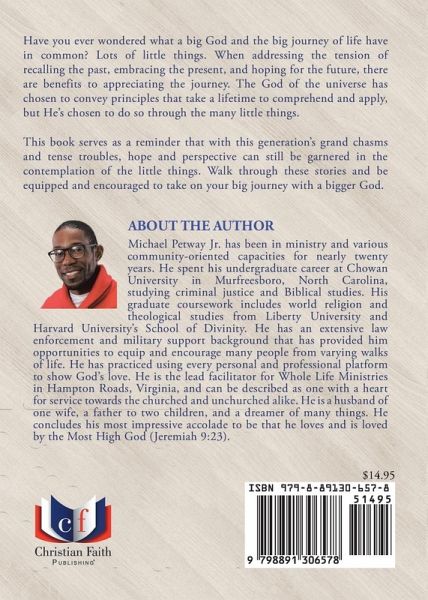 Have you ever wondered what a big God and the big journey of life have in common? Lots of little things. When addressing the tension of recalling the past, embracing the present, and hoping for the future, there are benefits to appreciating the journey. The God of the universe has chosen to convey principles that take a lifetime to comprehend and apply, but He's chosen to do so through the many little things. This book serves as a reminder that with this generation's grand chasms and tense troubles, hope and perspective can still be garnered in the contemplation of the little things. Walk through these stories and be equipped and encouraged to take on your big journey with a bigger God.