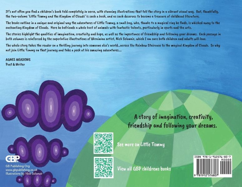 A children's book told completely in verse, with stunning illustrations, deserving to become a treasure of childhood literature. A small boy, with a magical ring he finds, is whisked away to the enchanting Kingdom of Clouds where he befriends a whole host of animals with fantastic talents. Imagination, creativity, hope." Agnes Meadows, loose muse