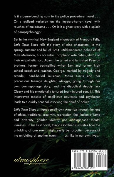 Is it a genre-bending spin to the police procedural novel...Or a stylized variation on the mystery-horror novel with touches of melodrama ...Or is it a ghost story with a splash of parapsychology? Set in the mythical New England microcosm of Fryebury Falls, Little Town Blues tells the story of nine characters, in the spring, summer and fall of 1984: Mild-mannered police chief Mike Melanson, his eccentric, prophetic wife "Miss Julie" and their empathetic son, Adam; the gifted and tarnished Pearson brothers, former best-selling writer Sam and former high school coach and teacher, George, marked by tragedy and scandal; hard-boiled musician, Moira Davis and her precocious teenage daughter, Maygyn, going through her own coming-of-age story; and the diabolical deputy Jack Cleary and his emotionally tortured brain-injured son, J.J. This interwoven mosaic of small-town neuroses and psychoses leads to a quirky scandal involving the chief of police. Little Town Blues critiques small-town America through the lens of ethics, traditions, creativity, repression, the illusion of fame and diversity, gender identity and undiagnosed mental illnesses. In his first novel, David Gonthier illustrates how the unfolding of one event might easily be forgotten because of the unfolding of another event...just like in our own lives.