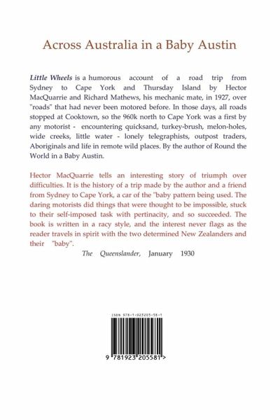Little Wheels is a humorous account of a road trip from Sydney to Cape York and Thursday Island by Hector MacQuarrie and Richard Mathews, his mechanic mate, in 1927, over "roads" that had never been motored before. In those days, all roads stopped at Cooktown, so the 960k north to Cape York was a first by any motorist - encountering quicksand, turkey-brush, melon-holes, wide creeks, little water - lonely telegraphists, outpost traders, Aboriginals and life in remote wild places. By the author of Round the World in a Baby Austin. Hector MacQuarrie tells an interesting story of triumph over difficulties. It is the history of a trip made by the author and a friend from Sydney to Cape York, a car of the "baby pattern being used. The daring motorists did things that were thought to be impossible, stuck to their self-imposed task with pertinacity, and so succeeded. The book is written in a racy style, and the interest never flags as the reader travels in spirit with the two determined New Zealanders and their "baby". - The Queenslander, January 1930