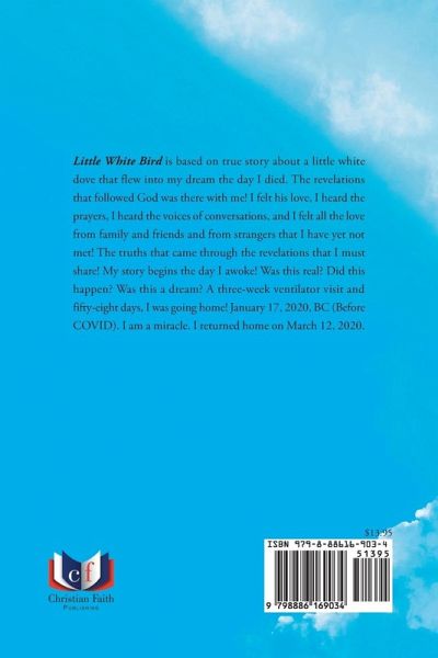 Little White Bird is based on true story about a little white dove that flew into my dream the day I died. The revelations that followed God was there with me! I felt his love, I heard the prayers, I heard the voices of conversations, and I felt all the love from family and friends and from strangers that I have yet not met! The truths that came through the revelations that I must share! My story begins the day I awoke! Was this real? Did this happen? Was this a dream? A three-week ventilator visit and fifty-eight days, I was going home! January 17, 2020, BC (Before COVID). I am a miracle. I returned home on March 12, 2020.