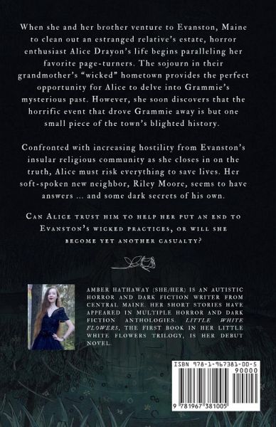 "Much like Shirley Jackson, Hathaway's gentle storytelling is like inhaling the aroma of a fresh cut flower, oblivious to the undercurrent of rot until it has settled deep into your bones." - Sage Nestler, author and Editor-in-Chief of Pride with a Bite When she and her brother venture to Evanston, Maine to clean out an estranged relative's estate, horror enthusiast Alice Drayon's life begins paralleling her favorite page-turners. The sojourn in their grandmother's "wicked" hometown provides the perfect opportunity for Alice to delve into Grammie's mysterious past. However, she soon discovers that the horrific event that drove Grammie away is but one small piece of the town's blighted history. Confronted with increasing hostility from Evanston's insular religious community as she closes in on the truth, Alice must risk everything to save lives. Her soft-spoken new neighbor, Riley Moore, seems to have answers ... and some dark secrets of his own. Can Alice trust him to help her put an end to Evanston's wicked practices, or will she become yet another casualty? Little Eve meets "The Lottery" meets "Children of the Corn." Perfect for readers who love: Slow burn horror Family secrets Creepy small towns Religious cults