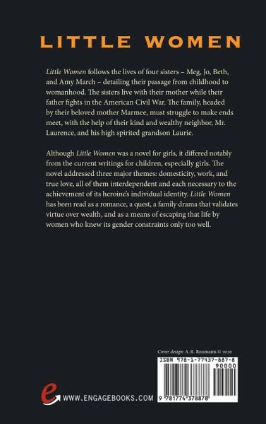Little Women follows the lives of four sisters - Meg, Jo, Beth, and Amy March - detailing their passage from childhood to womanhood. The sisters live with their mother while their father fights in the American Civil War. The family, headed by their beloved mother Marmee, must struggle to make ends meet, with the help of their kind and wealthy neighbor, Mr. Laurence, and his high spirited grandson Laurie. Although Little Women was a novel for girls, it differed notably from the current writings for children, especially girls. The novel addressed three major themes: domesticity, work, and true…mehr