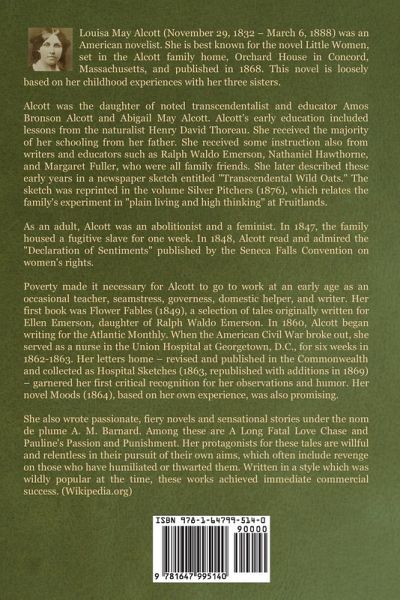 Louisa May Alcott (November 29, 1832 – March 6, 1888) was an American novelist. She is best known for the novel Little Women, set in the Alcott family home, Orchard House in Concord, Massachusetts, and published in 1868. This novel is loosely based on her childhood experiences with her three sisters. Alcott was the daughter of noted transcendentalist and educator Amos Bronson Alcott and Abigail May Alcott. Alcott's early education included lessons from the naturalist Henry David Thoreau. She received the majority of her schooling from her father. She received some instruction also from writers and educators such as Ralph Waldo Emerson, Nathaniel Hawthorne, and Margaret Fuller, who were all family friends. She later described these early years in a newspaper sketch entitled "Transcendental Wild Oats." The sketch was reprinted in the volume Silver Pitchers (1876), which relates the family's experiment in "plain living and high thinking" at Fruitlands. As an adult, Alcott was an abolitionist and a feminist. In 1847, the family housed a fugitive slave for one week. In 1848, Alcott read and admired the "Declaration of Sentiments" published by the Seneca Falls Convention on women's rights. Poverty made it necessary for Alcott to go to work at an early age as an occasional teacher, seamstress, governess, domestic helper, and writer. Her first book was Flower Fables (1849), a selection of tales originally written for Ellen Emerson, daughter of Ralph Waldo Emerson. In 1860, Alcott began writing for the Atlantic Monthly. When the American Civil War broke out, she served as a nurse in the Union Hospital at Georgetown, D.C., for six weeks in 1862-1863. Her letters home – revised and published in the Commonwealth and collected as Hospital Sketches (1863, republished with additions in 1869) – garnered her first critical recognition for her observations and humor. Her novel Moods (1864), based on her own experience, was also promising. She also wrote passionate, fiery novels and sensational stories under the nom de plume A. M. Barnard. Among these are A Long Fatal Love Chase and Pauline's Passion and Punishment. Her protagonists for these tales are willful and relentless in their pursuit of their own aims, which often include revenge on those who have humiliated or thwarted them. Written in a style which was wildly popular at the time, these works achieved immediate commercial success. (Wikipedia.org)