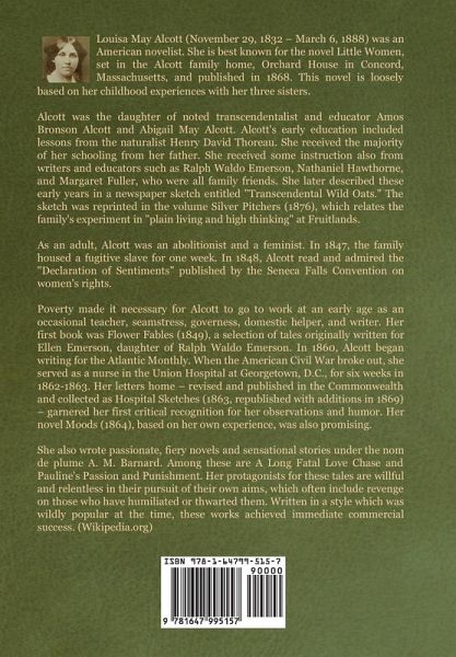 Louisa May Alcott (November 29, 1832 – March 6, 1888) was an American novelist. She is best known for the novel Little Women, set in the Alcott family home, Orchard House in Concord, Massachusetts, and published in 1868. This novel is loosely based on her childhood experiences with her three sisters. Alcott was the daughter of noted transcendentalist and educator Amos Bronson Alcott and Abigail May Alcott. Alcott's early education included lessons from the naturalist Henry David Thoreau. She received the majority of her schooling from her father. She received some instruction also from writers and educators such as Ralph Waldo Emerson, Nathaniel Hawthorne, and Margaret Fuller, who were all family friends. She later described these early years in a newspaper sketch entitled "Transcendental Wild Oats." The sketch was reprinted in the volume Silver Pitchers (1876), which relates the family's experiment in "plain living and high thinking" at Fruitlands. As an adult, Alcott was an abolitionist and a feminist. In 1847, the family housed a fugitive slave for one week. In 1848, Alcott read and admired the "Declaration of Sentiments" published by the Seneca Falls Convention on women's rights. Poverty made it necessary for Alcott to go to work at an early age as an occasional teacher, seamstress, governess, domestic helper, and writer. Her first book was Flower Fables (1849), a selection of tales originally written for Ellen Emerson, daughter of Ralph Waldo Emerson. In 1860, Alcott began writing for the Atlantic Monthly. When the American Civil War broke out, she served as a nurse in the Union Hospital at Georgetown, D.C., for six weeks in 1862-1863. Her letters home – revised and published in the Commonwealth and collected as Hospital Sketches (1863, republished with additions in 1869) – garnered her first critical recognition for her observations and humor. Her novel Moods (1864), based on her own experience, was also promising. She also wrote passionate, fiery novels and sensational stories under the nom de plume A. M. Barnard. Among these are A Long Fatal Love Chase and Pauline's Passion and Punishment. Her protagonists for these tales are willful and relentless in their pursuit of their own aims, which often include revenge on those who have humiliated or thwarted them. Written in a style which was wildly popular at the time, these works achieved immediate commercial success. (Wikipedia.org)