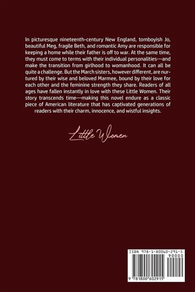 Do you want to read Little Women? If so then keep reading... In picturesque nineteenth-century New England, tomboyish Jo, beautiful Meg, fragile Beth, and romantic Amy are responsible for keeping a home while their father is off to war. At the same time, they must come to terms with their individual personalities-and make the transition from girlhood to womanhood. It can all be quite a challenge. But the March sisters, however different, are nurtured by their wise and beloved Marmee, bound by their love for each other and the feminine strength they share. Readers of all ages have fallen…mehr