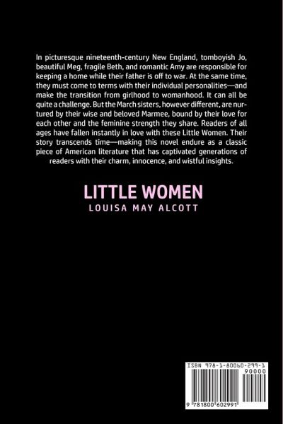 Do you want to read Little Women? If so then keep reading... In picturesque nineteenth-century New England, tomboyish Jo, beautiful Meg, fragile Beth, and romantic Amy are responsible for keeping a home while their father is off to war. At the same time, they must come to terms with their individual personalities-and make the transition from girlhood to womanhood. It can all be quite a challenge. But the March sisters, however different, are nurtured by their wise and beloved Marmee, bound by their love for each other and the feminine strength they share. Readers of all ages have fallen instantly in love with these Little Women. Their story transcends time-making this novel endure as a classic piece of American literature that has captivated generations of readers with their charm, innocence, and wistful insights. What are you waiting for Little Women is one click away, select the "Buy Now" button in the top right corner NOW!