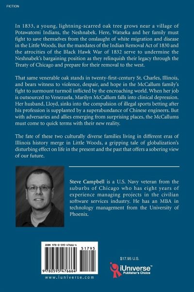 In 1833, a young, lightning-scarred oak tree grows near a village of Potawatomi Indians, the Neshnabek. Here, Watseka and her family must fight to save themselves from the onslaught of white migration and disease in the Little Woods. But the mandates of the Indian Removal Act of 1830 and the atrocities of the Black Hawk War of 1832 serve to undermine the Neshnabek's bargaining position as they relinquish their legacy through the Treaty of Chicago and prepare for their removal to the west. That same venerable oak stands in twenty-first-century St. Charles, Illinois, and bears witness to violence, despair, and hope in the McCallum family's fight to surmount turmoil inflicted by the encroaching world. When her job is outsourced to Venezuela, Marilyn McCallum falls into clinical depression. Her husband, Lloyd, sinks into the compulsion of illegal sports betting after his profession is supplanted by a superabundance of Chinese engineers. But with adversaries and allies emerging from surprising places, the McCallums must come to quick terms with their new reality. The fate of these two culturally diverse families living in different eras of Illinois history merge in Little Woods, a gripping tale of globalization's disturbing effect on life in the present and the past that offers a sobering view of our future.