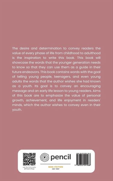 The desire and determination to convey readers the value of every phase of life from childhood to adulthood is the inspiration to write this book. This book will showcase the words that the younger generation needs to know so that they can use them as a guide in their future endeavors. This book contains words with the goal of telling young people, teenagers, and even young adults the words that the author wishes she had known as a youth. Its goal is to convey an encouraging message and an early life lesson to young readers. Aims of this book are to emphasize the value of personal growth, achievement, and life enjoyment in readers' minds, which the author wishes to convey even in their youth.