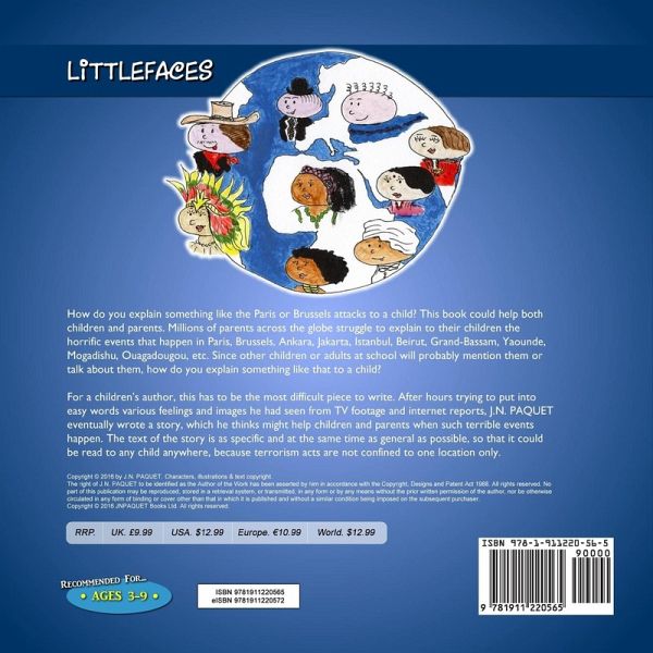 How do you explain something like the Paris or Brussels attacks to a child? This book could help both children and parents. Millions of parents across the globe struggle to explain to their children the horrific events that happen in Paris, Brussels, Ankara, Jakarta, Istanbul, Beirut, Grand-Bassam, Yaounde, Mogadishu, Ouagadougou, Lahore, etc. Since other children or adults at school will probably mention them or talk about them, how do you explain something like that to a child? For a children’s author, this has to be the most difficult piece to write. After hours trying to put into easy words various feelings and images he had seen from TV footage and internet reports, J.N. PAQUET eventually wrote a story, which he thinks might help children and parents when such terrible events happen. The text of the story is as specific and at the same time as general as possible, so that it could be read to any child anywhere, because terrorism acts are not confined to one location only. --- ADVICE TO PARENTS: Sometimes, what we imagine can be worse than what we actually see. That's why expressing our feeling through writing or drawing can help free our mind, and so, help us to move on. "It is crucial that children can talk about their feelings following these senseless killings, and are given reassurance and support." (Peter Wanless / Chief executive of the NSPCC) If you are still unsure what to say or what to do to explain something like a terrorist attack to your children, follow the NSPCC advice to parents on talking about difficult topics: www.nspcc.org.uk/talkingtips For more advice you may also watch the video "How should you talk to your children about terrorism": www.thetimes.co.uk/nspcc/ Finally, for more information, visit the NSPCC website: www.nspcc.org.uk (The National Society for the Prevention of Cruelty to Children (NSPCC) is a charity campaigning and working in child protection in the United Kingdom and the Channel Islands.)