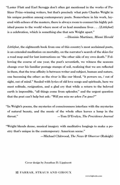 Littlefoot, the eighteenth book from one of this country's most acclaimed poets, is an extended meditation on mortality, on the narrator's search of the skies for a road map and for last instructions on "the other side of my own death." Following the course of one year, the poet's seventieth, we witness the seasons change over his familiar postage stamps of soil, realizing that we are reflected in them, that the true affinity is between writer and subject, human and nature, one becoming the other, as the river is like our blood, "it powers on, / out of sight, out of mind." Seeded with lyrics of old love songs and spirituals, here we meet solitude, resignation, and a glad cry that while a return to the beloved earth is impossible, "all things come from splendor," and the urgent question that the poet can't help but ask: "Will you miss me when I'm gone?