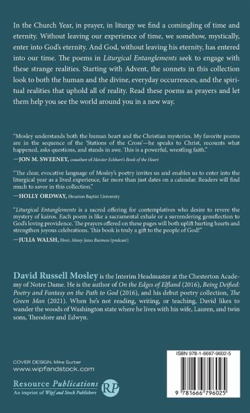 In the church year, in prayer, in liturgy we find a comingling of time and eternity. Without leaving our experience of time, we somehow, mystically, enter into God's eternity. And God, without leaving his eternity, has entered into our time. The poems in Liturgical Entanglements seek to engage with these strange realities. Starting with Advent, the sonnets in this collection look to both the human and the divine, everyday occurrences, and the spiritual realities that uphold all of reality. Read these poems as prayers and let them help you see the world around you in a new way.