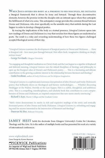 When Jesus offers his body as a promise to his disciples, he initiates a liturgical framework that is driven by irony and betrayal. Through these deconstructive elements, however, the promise invites the disciples into an intimate space where they anticipate the fulfillment of what is to come. This anticipatory energy provides the common thread between Donne and Dickinson, who draw specifically on the unstable story that unfolds during the Last Supper in order to develop a liturgical poetics. By tracing the implications of the body as a textual presence, Liturgical Liaisons opens into new readings of Donne and Dickinson in a way that enriches how these figures are understood as poets. The result is a risky and rewarding understanding of how these two figures challenged accepted theological norms of their day.