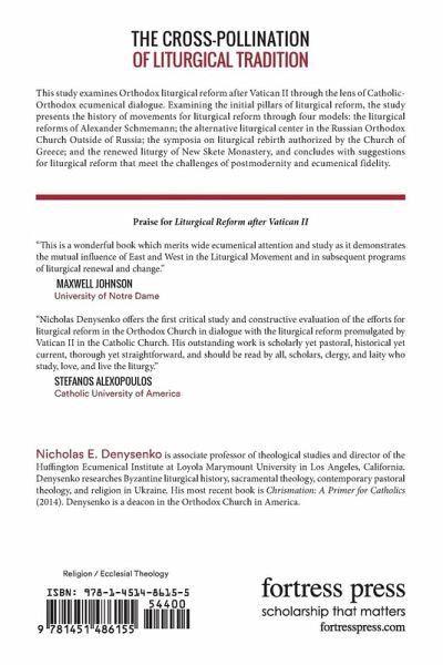 This study examines Orthodox liturgical reform after Vatican II through the lens of Catholic-Orthodox ecumenical dialogue. Examining the initial pillars of liturgical reform, the study presents the history of movements for liturgical reform through four models: the liturgical reforms of Alexander Schmemann; the alternative liturgical center in the Russian Orthodox Church Outside of Russia (ROCOR); the symposia on liturgical rebirth authorized by the Church of Greece; and the renewed liturgy of New Skete Monastery, and concludes with suggestions for liturgical reform that meet the challenges of postmodernity and ecumenical fidelity.