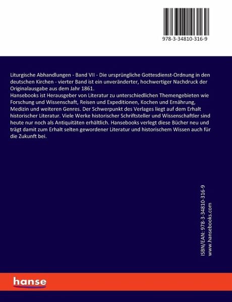 Liturgische Abhandlungen - Band VII - Die ursprüngliche Gottesdienst-Ordnung in den deutschen Kirchen - vierter Band ist ein unveränderter, hochwertiger Nachdruck der Originalausgabe aus dem Jahr 1861.Hansebooks ist Herausgeber von Literatur zu unterschiedlichen Themengebieten wie Forschung und Wissenschaft, Reisen und Expeditionen, Kochen und Ernährung, Medizin und weiteren Genres. Der Schwerpunkt des Verlages liegt auf dem Erhalt historischer Literatur. Viele Werke historischer Schriftsteller und Wissenschaftler sind heute nur noch als Antiquitäten erhältlich. Hansebooks verlegt diese Bücher neu und trägt damit zum Erhalt selten gewordener Literatur und historischem Wissen auch für die Zukunft bei.