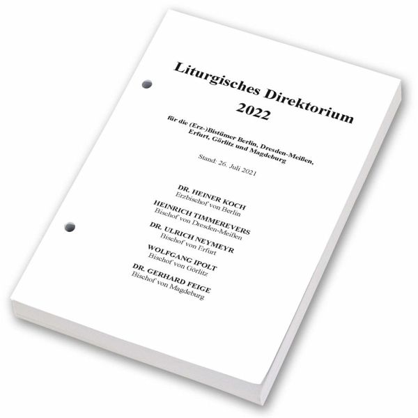 Das gemeinsame Direktorium 2022 der (Erz-)Diözesen Berlin, Dresden-Meißen, Erfurt, Görlitz und Magdeburg enthält alle Angaben für die Messfeier und die Stundenliturgie. Dafür wurden in die von den deutschsprachigen liturgischen Instituten erarbeitete Vorlage die Eigenfeiern der einzelnen Diözesen mit ihren Besonderheiten eingefügt. Mit Einleitungen zu den Festzeiten, den liturgischen Lesungen des Tages, Vorschlägen für die Orationen, den monatlichen Gebetsanliegen des Papstes, Texten zu den neuen Heiligen u. v. m.Die Sammlung enthält:- verbindliche Angaben zu den Gottesdienstfeiern für jede Pfarrei- Hinweise zur Feier der Stundenliturgie, zu Festen und Gedenktagen- Vorschläge für Tages-, Gaben- & Schlussgebet- monatliche Gebetsanliegen des Papstes- Texte & Gebete für die neuen Gedenktage