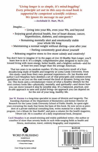 In "Live 10 Healthy Years Longer," biostatician Dr. Jan Kuzma and prolific writer Cecil Murphey make a startling connection between the spiritual and physical realms of our lives. After an in-depth 25-year study involving more than 27,000 participants, they discovered an amazing medical breakthrough that offers each of us the potential to live longer, healthier and happier lives. The "live longer lifestyle," based on Kuzma's years of research in longevity, present practical suggestions for reducing heart disease and cancer, losing weight, increasing vitality, enjoying life, and faithfully caring for the body that God has given each of us.