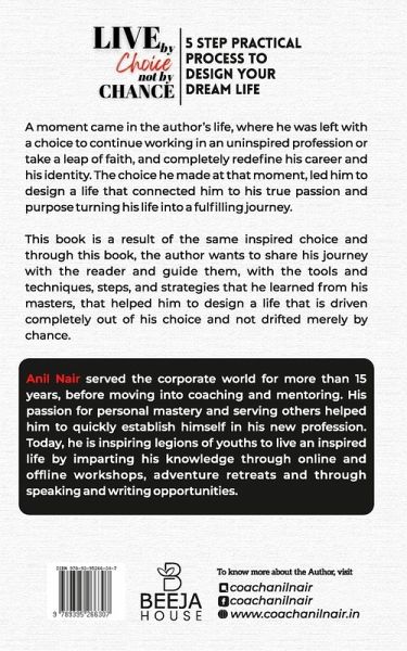 A moment came in the author's life, where he was left with a choice to continue working in an uninspired profession or take a leap of faith, and completely redefine his career and his identity. The choice he made at that moment, led him to design a life that connected him to his true passion and purpose turning his life into a fulfilling journey. This book is a result of the same inspired choice and through this book, the author wants to share his journey with the reader and guide them, with the tools and techniques, steps, and strategies that he learned from his masters, that helped him to design a life that is driven completely out of his choice and not drifted merely by chance. _________________________________________________________________________ ABOUT THE AUTHOR Anil Nair served the corporate world for more than 15 years, before moving into coaching and mentoring. His passion for personal mastery and serving others helped him to quickly establish himself in his new profession. Today, he is inspiring legions of youths to live an inspired life by imparting his knowledge through online and offline workshops, adventure retreats and through speaking and writing opportunities.