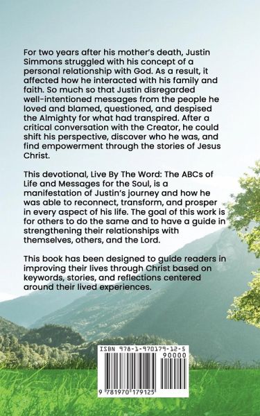 For two years after his mother's death, Justin Simmons struggled with his concept of a personal relationship with God. As a result, it affected how he interacted with his family and faith. So much so that Justin disregarded well-intentioned messages from the people he loved and blamed, questioned, and despised the Almighty for what had transpired. After a critical conversation with the Creator, he could shift his perspective, discover who he was, and find empowerment through the stories of Jesus Christ. This devotional, Live By The Word: The ABCs of Life and Messages for the Soul, manifests Justin's journey and how he was able to reconnect, transform, and prosper in every aspect of his life. The goal of this work is for others to do the same and have a guide in strengthening their relationships with themselves, others, and the Lord. This book has been designed to guide readers in improving their lives through Christ based on keywords, stories, and reflections centered around their lived experiences.
