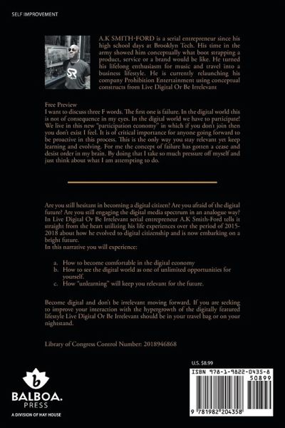 Are you still hesitant in becoming a digital citizen? Are you afraid of the digital future? Are you still engaging the digital media spectrum in an analogue way? In Live Digital Or Be Irrelevant serial entrepreneur A.K Smith-Ford tells it straight from the heart utilizing his life experiences over the period of 2015-2018 about how he evolved to digital citizenship and is now embarking on a bright future. In this narrative you will experience: a. How to become comfortable in the digital economy b. How to see the digital world as one of unlimited opportunities for yourself. c. How unlearning will keep you relevant for the future. Become digital and dont be irrelevant moving forward. If you are seeking to improve your interaction with the hypergrowth of the digitally featured lifestyle Live Digital Or Be Irrelevant should be in your travel bag or on your nightstand.