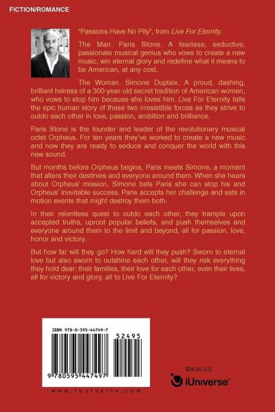 "Passions Have No Pity", from Live For Eternity. The Man. Paris Stone. A fearless, seductive, passionate musical genius who vows to create a new music, win eternal glory and redefine what it means to be American, at any cost. The Woman. Simone Duplaix. A proud, dashing, brilliant heiress of a 300-year-old secret tradition of American women, who vows to stop him because she loves him. Live For Eternity tells the epic human story of these two irresistible forces as they strive to outdo each other in love, passion, ambition and brilliance. Paris Stone is the founder and leader of the revolutionary musical octet Orpheus. For ten years they've worked to create a new music and now they are ready to seduce and conquer the world with this new sound. But months before Orpheus begins, Paris meets Simone, a moment that alters their destinies and everyone around them. When she hears about Orpheus' mission, Simone bets Paris she can stop his and Orpheus' inevitable success. Paris accepts her challenge and sets in motion events that might destroy them both. In their relentless quest to outdo each other, they trample upon accepted truths, uproot popular beliefs, and push themselves and everyone around them to the limit and beyond, all for passion, love, honor and victory. But how far will they go? How hard will they push? Sworn to eternal love but also sworn to outshine each other, will they risk everything they hold dear: their families, their love for each other, even their lives, all for victory and glory, all to Live For Eternity?