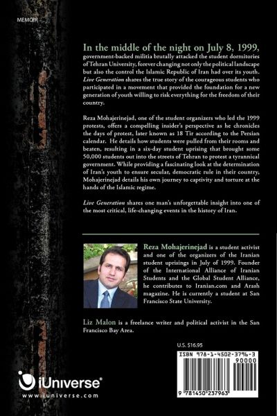 In the middle of the night on July 8, 1999, government-backed militia brutally attacked the student dormitories of Tehran University, forever changing not only the political landscape but also the control the Islamic Republic of Iran had over its youth. Live Generation shares the true story of the courageous students who participated in a movement that provided the foundation for a new generation of youth willing to risk everything for the freedom of their country. Reza Mohajerinejad, one of the student organizers who led the 1999 protests, offers a compelling insider's perspective as he chronicles the days of protest, later known as 18 Tir on the Persian calendar. He details how students were pulled from their rooms and beaten, resulting in a six-day student uprising that brought some 50,000 students out into the streets of Tehran to protest a tyrannical government. While providing a fascinating look at the determination of Iran's youth to ensure secular, democratic rule in their country, Mohajerinejad details his own journey to captivity and torture at the hands of the Islamic regime. Live Generation shares one man's unforgettable insight into one of the most critical, life-changing events in the history of Iran.