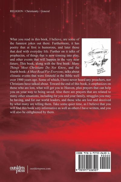 What you read in this book, I believe, are some of the funniest jokes out there. Furthermore, it has poetry that at first is humorous, and later those that deal with everyday life. Further on it talks of prophecies, of things that is now coming into play, and other events that will happen in the very near future. This book, along with the first book: Many Things Most Christians Do Not Know, and the fourth book: A Must Read For Everyone, talks about climatic events that were foretold in the Bible well over 1900 years ago. Some of which, I have never heard any preachers, nor Christians have talked about. Toward the end of this book, it emphasizes on those who are lost, what will get you to Heaven, plus prayers that can help you on your way to being saved. Also there are prayers that are related to many other situations, including for you and your family, struggles you may be having, and for our world leaders, and those who are lost and deceived by what many are telling them. Take some quiet time, as I believe that you will find this book very informative as well as others I have written, and you will also be enlightened by them.
