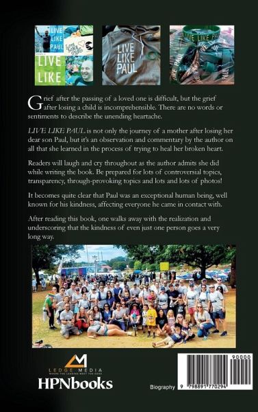 LIVE LIKE PAUL is not only the journey of a mother after losing her dear son Paul, but it s an observation and commentary by the author on all that she learned in the process of trying to heal her broken heart. Readers will laugh and cry throughout as the author admits she did while writing the book. Be prepared for lots of controversial topics, transparency, thought provoking topics and lots and lots of photos! It becomes quite clear that Paul was an exceptional human being, well known for his kindness, affecting everyone he came in contact with, as shown in the testimonial section of the book. These were just a few of the hundreds that were sent to the author. After reading this book, one walks away with the realization and underscoring that the kindness of even just one person goes a very long way.
