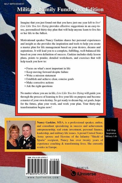 Imagine that you just found out that you have just one year left to live! Live Like You Are Dying provides effective suggestions in an easy-to-use, personalized thirty-day plan that will help anyone learn to live his or her life to the fullest. Motivational speaker Nancy Gaskins shares her personal experiences and insight as she provides the inspiration and tools to help you create a master plan for life management based on your desires, dreams and aspirations. It will lead you to a complete, fulfilling, well-balanced life based on your own definition of success. Gaskins includes daily lesson plans, points to ponder, detailed worksheets, and exercises that will help teach you how to: Focus on what's most important in life Keep moving forward despite failure Write a mission statement Establish and achieve clear, concise goals Make corrective actions Ask the right questions No matter where you are in life, Live Like You Are Dying will guide you through the process of learning to live your life on purpose and become a master of your own destiny. So get ready to dream big, set goals, hope for the future, plan your work, and work your plan. Your thirty-day transformation begins now!