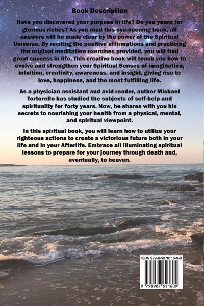 Book Description Have you discovered your purpose in life? Do you yearn for glorious riches? As you read this eye-opening book, all answers will be made clear by the power of the Spiritual Universe. By reciting the positive affirmations and practicing the original meditation exercises provided, you will find great success in life. This creative book will teach you how to evolve and strengthen your Spiritual Senses of imagination, intuition, creativity, awareness, and insight, giving rise to love, happiness, and the most fulfilling life. As a physician assistant and avid reader, author Michael Tortorello has studied the subjects of self-help and spirituality for forty years. Now, he shares with you his secrets to nourishing your health from a physical, mental, and spiritual viewpoint. In this spiritual book, you will learn how to utilize your righteous actions to create a victorious future both in your life and in your Afterlife. Embrace all illuminating spiritual lessons to prepare for your journey through death and, eventually, to heaven.