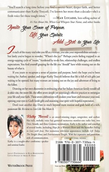 In each of the many vital roles you fill as a woman, you take your responsibilities seriously-but lately you've begun to wonder, "Where's the joy?” Perhaps you're feeling trapped in an energy-sapping cycle of "musts,” burdened by to-do lists, relationship challenges, and endless expectations. You find yourself grasping for the life you "should” have while missing out on the beauty of what is. If you yearn to recapture a sense of passion and purpose, here's the hope you've been waiting for. Author, speaker, and singer Kathy Troccoli believes that life is full of rich gifts just waiting to be opened, but many women are missing out on the joy and adventure of living to the fullest. Drawing on her own discoveries in embracing what her Italian-American family would call la dolce vita, the sweet life, she offers seven simple yet surprisingly effective practices to reenergize your life and your faith. These seven celebrations will awaken your heart and romance your soul, opening your eyes to God's lavish gifts and seasoning your spirit with hopeful expectation. Don't wait another day. Dare to reach beyond mere routine and grab hold of a rich, passionate life. It's time to Live Like You Mean It.