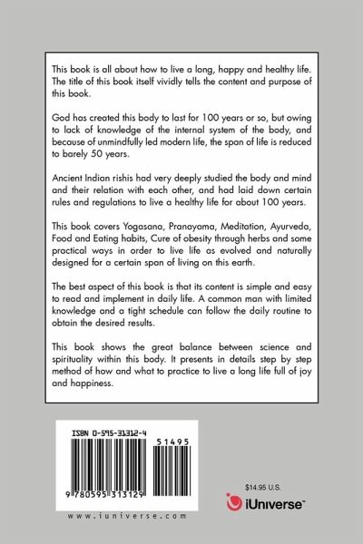 This book is all about how to live a long, happy and healthy life. The title of this book itself vividly tells the content and purpose of this book. God has created this body to last for 100 years or so, but owing to lack of knowledge of the internal system of the body, and because of unmindfully led modern life, the span of life is reduced to barely 50 years. Ancient Indian rishis had very deeply studied the body and mind and their relation with each other, and had laid down certain rules and regulations to live a healthy life for about 100 years. This book covers Yogasana, Pranayama, Meditation, Ayurveda, Food and Eating habits, Cure of obesity through herbs and some practical ways in order to live life as evolved and naturally designed for a certain span of living on this earth. The best aspect of this book is that its content is simple and easy to read and implement in daily life. A common man with limited knowledge and a tight schedule can follow the daily routine to obtain the desired results. This book shows the great balance between science and spirituality within this body. It presents in details step by step method of how and what to practice to live a long life full of joy and happiness.